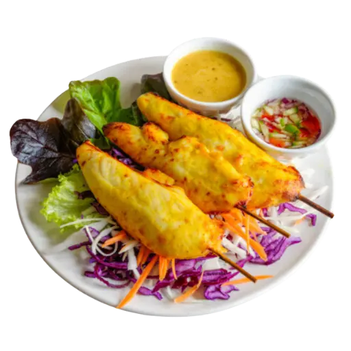 Brochettes de poulet saté marinées, grillées et servies avec sauce cacahuète. Un incontournable, à la fois gourmand et parfumé.
