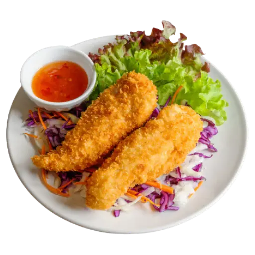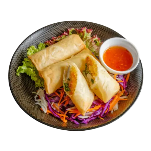 Rouleaux croustillants aux légumes, servis avec une sauce douce légèrement sucrée. Parfait à partager en entrée.