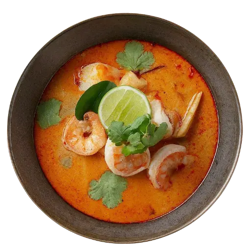 Soupe thaïe mythique aux crevettes : citronnelle, galanga, citron vert et notes pimentées. Un équilibre parfait entre acidulé, parfumé et relevé.