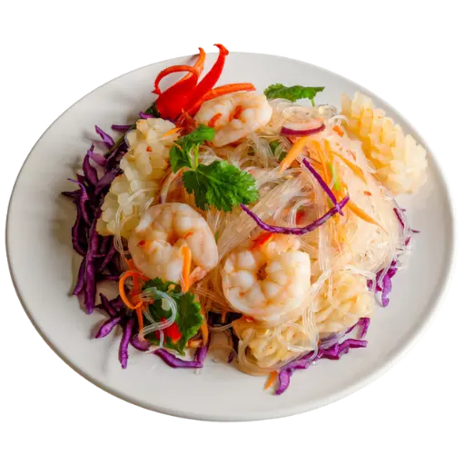 Salade thaï fraîche et parfumée à base de vermicelles, fruits de mer et herbes aromatiques. Assaisonnement citronné, légèrement pimenté, ultra léger.